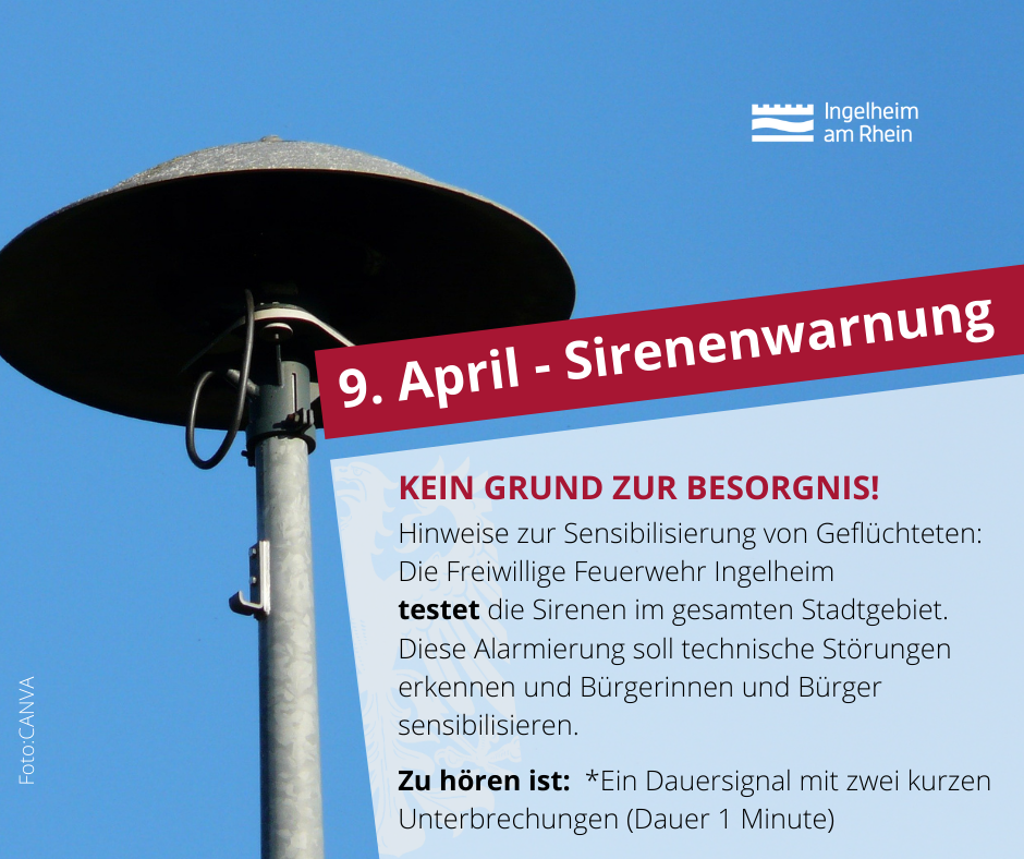 Am Samstag, 9. April 2022, testet die Freiwillige Feuerwehr der Stadt Ingelheim am Rhein ab 12 Uhr die Sirenen im gesamten Stadtgebiet. „Ziel der Probealarmierung soll es sein, technische Störungen der Anlagen zu erkennen, aber auch die Ingelheimer Bürgerinnen und Bürger zu sensibilisieren und den Warnprozess transparenter zu gestalten“, so Dr. Christiane Döll, zuständige Dezernentin. Bundesweit stehen Kommunen im Rahmen der Sirenenwarnungen vor einer großen Herausforderung, denn seit der Katastrophe im Ahrtal hat die Sirenenwarnung an Bedeutung in der gesellschaftlichen Wahrnehmung gewonnen. Aber auch bei den Geflüchteten aus der Ukraine sorgt das Aufheulen der Sirenen für große Verunsicherung. „Aus diesem Grund bitte ich alle Ingelheimerinnen und Ingelheimer Geflüchtete über die Probealarmierung zu informieren und aufzuklären“, so Döll abschließend.