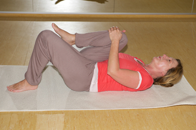 a) Ziehen Sie das rechte Bein über den Bauch und umfassen Sie mit beiden Händen das Knie. Ihr Kopf ruht dabei auf dem Boden. Atmen Sie ruhig und regelmäßig in den Bauch hinein. Dabei können Sie spüren, wie sich einatmend die Bauchdecke hebt und ausatmend senkt. Auf der rechten Seite trifft die Bauchdecke auf einen Widerstand: den rechten Oberschenkel. Es entsteht auf diese Weise eine Massagewirkung für alle Bauchinnenorgane auf der rechten Seite. Massage bedeutet immer eine verstärkte Durchblutung und damit Entgiftung und Ernährung der Zellen. Atmen Sie auf diese Weise sehr ruhig und regelmäßig in den Bauch, machen Sie sich die Massage bewusst. Nach etwa 1 bis 3 Minuten lösen Sie die Haltung wieder auf, stellen den rechten Fuß auf den Boden und spüren kurz nach. Schicken Sie dabei wieder einen tiefen Atemzug in den Bauch.