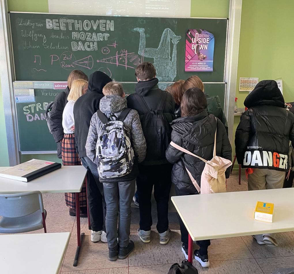 Am Ende des rund einstündigen Vortrags bildet sich im Klassenzimmer eine Traube um Enno-Ilka Uhde. Der Musikprofessor und Performance-Designer zeigt den Schülerinnen und Schülern auf seinem Tablet, welche Projekte er realisiert. Kurze Videos vermitteln einen Überblick über seine Arbeit. „Ich inszeniere in der ganzen Welt Opern, Gala-Shows oder Sportveranstaltungen“, erklärt Enno Uhde dem Kurs, der von Lehrerin Tatyana Vester auf den Besuch bestens vorbereitet worden ist. Im Unterricht hatten sich die Sechst- bis Zehntklässler, die den Kurs „Zweitsprache Deutsch“ (DaZ) besuchen, nicht nur mit klassischer Musik und Streetdance beschäftigt, sie hatten sich auch über Enno-Ilka Uhde informiert, der Anfang März in der Ingelheimer kING eine ungewöhnliche Performance auf die Bühne bringen wird. „Upside Down – Streetdance meets Classic“ heißt die Multimedia-Show, die von der Ingelheimer Kultur und Marketing GmbH (IkUM) veranstaltet wird.