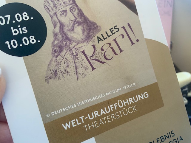 Zwischenzeitlich wurde es langsam dunkel und der Himmel verfärbte sich von grau-weiß zu einem schönen dunkelblau. Jetzt versetzte die Illumination die Aula Regia in einen Charme von rot, blau und lila. Und natürlich wurde dann auch passend zum nächsten Stück „Orange Coloured Sky“ das Licht in Orange getaucht.