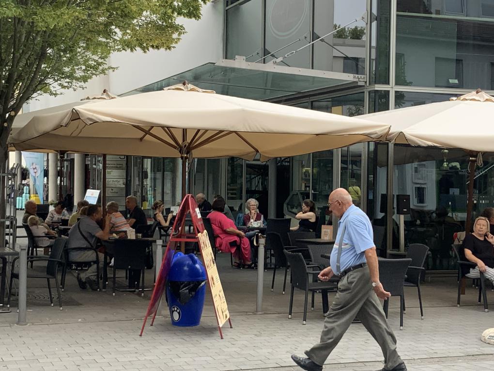 Nach drei Monaten Fußgängerzone in Teilen der Bahnhofstraße und Bingerstraße hat sich einiges verändert. Es ist deutlich ruhiger geworden. Wer durch die Bahnhofstraße flaniert, stellt fest, dass man gemütlich spazieren kann, Mütter lassen ihre kleinen Kinder auch schon einmal alleine auf der Fahrbahn laufen. Viele Besucher schlecken gemütlich ein Eis und haben sich auf den Bänken niedergelassen. Etliche Geschäfte haben ihre Außengastronomie erweitert. Bei Maya kann man nun auch auf der gegenüberliegenden Seite Platz nehmen und dort einen Snack und Kaffee zu sich nehmen. Auch die Eisdiele hat die Anzahl der Tische erhöht und erfreut sich bei gutem Wetter zahlreicher Besucher. Wer in der Nachbarschaft bei Edeka einkaufen geht, kann sich ebenfalls an einem der Tische im Außenbereich eine Pause gönnen. Selbst bei „Asian Food“ direkt gegenüber, kann man nun an der frischen Luft speisen, die Tische sind liebevoll mit Blumen verziert.