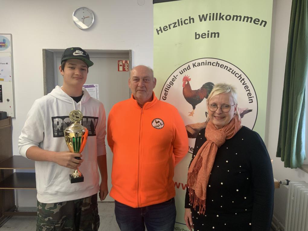 Geehrt wurde in diesem Jahr des 120jährigen Bestehens Tim Luca Rösch, der mit 386 Punkten die beste Zuchtgruppe für kastanienbraune Lothringer nachweisen konnte. Er erhielt den Pokal der Landrätin. Norbert Rösch überbrachte die Glückwünsche des Landesverbandes für die gelungene Doppelschau. Gerhard Knorr, Kreisvorsitzender Rassekaninchen, bedankte sich bei den Züchtern für die herausragende Arbeit und beglückwünschte diese zu ihrem Erfolg. Auch Helmut Rohr, 2. Vorsitzender des Vereins, brachte seinen Dank zum Ausdruck und zeigte sich erfreut, dass man traditionell wieder in der Alten Markthalle in Ingelheim ausstellen durfte.