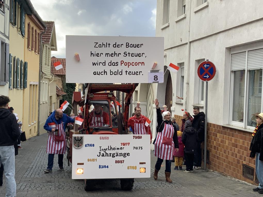 Auch die Politik kam nicht zu kurz. Die Bauernproteste der vergangenen Wochen blieben auch in Ingelheim nicht ohne Folgen: „Zahlt der Bauer hier mehr Steuer, wird das Popcorn auch bald teurer“, konnte man auf Wagen 8 der Ingelheimer Jahrgänge lesen. Sinngemäß wurde dann auch Popcorn an die Schaulustigen verteilt. Die Elsheimer wurden auf ihrem Wagen noch deutlicher: „Gesetze und Regeln ohne Verstand. Erst stirbt der Bauer, dann das Land“.