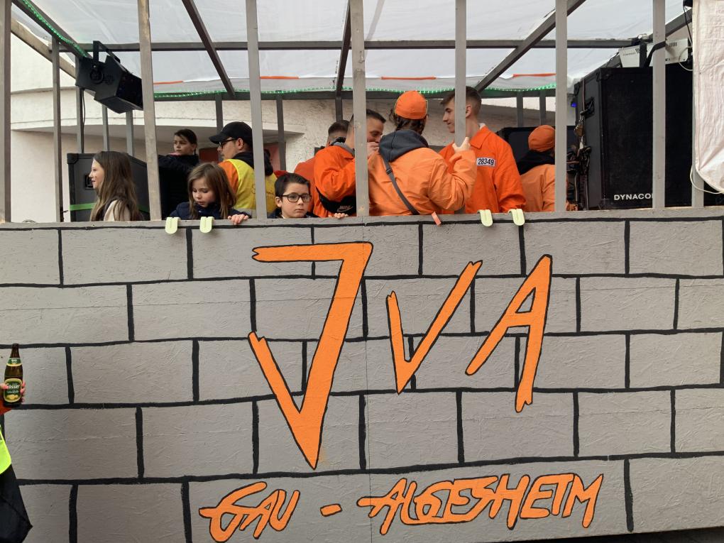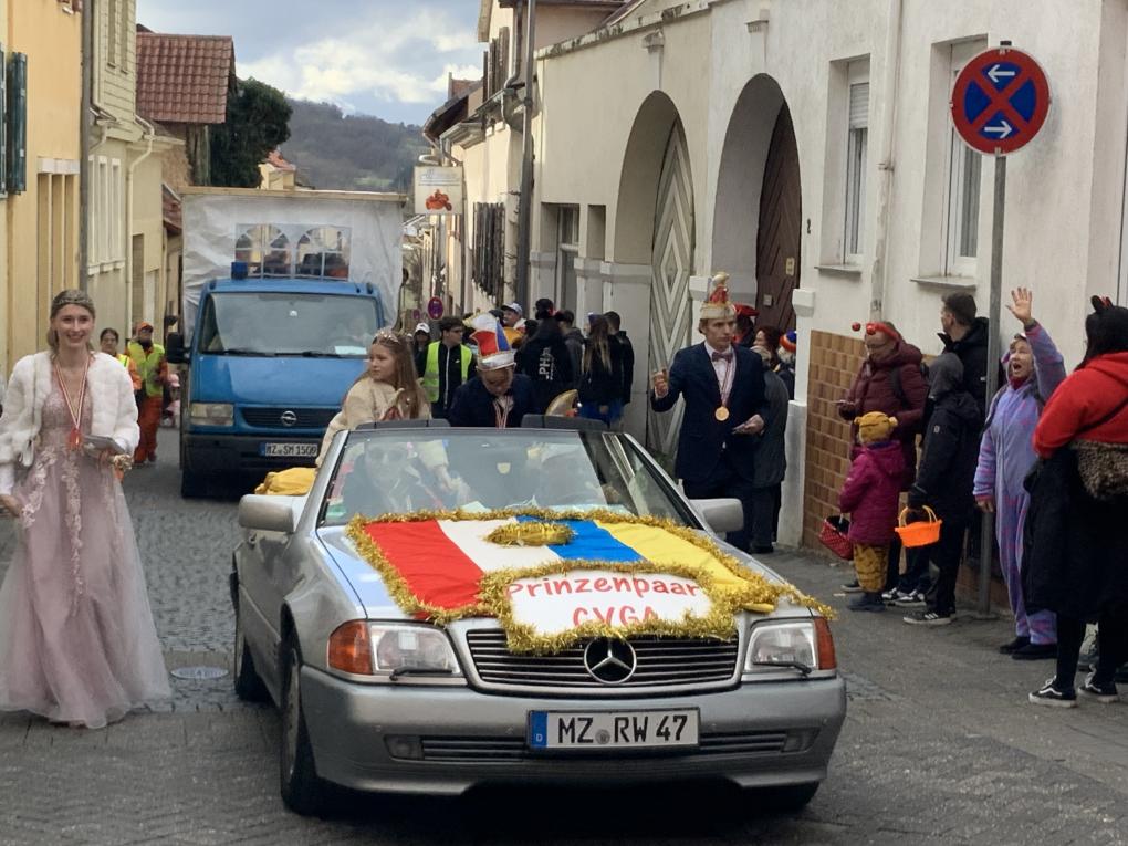 Die Guggemusiker mit scheinbar „schräger“ Musik machten den Anfang. In ihren schwarz-lila Kostümen konnte man schon glauben, dass sie dem Winter den Garaus machen. Im festlich geschmückten Mercedes Cabrio salutierte das Prinzenpaar, in eleganter Robe, wie es sich für royale Häupter schickt. Gau-Algesheim glänzte mit einem Wagen, der die Städter hinter Gittern zeigte – JVA Gau-Algesheim.