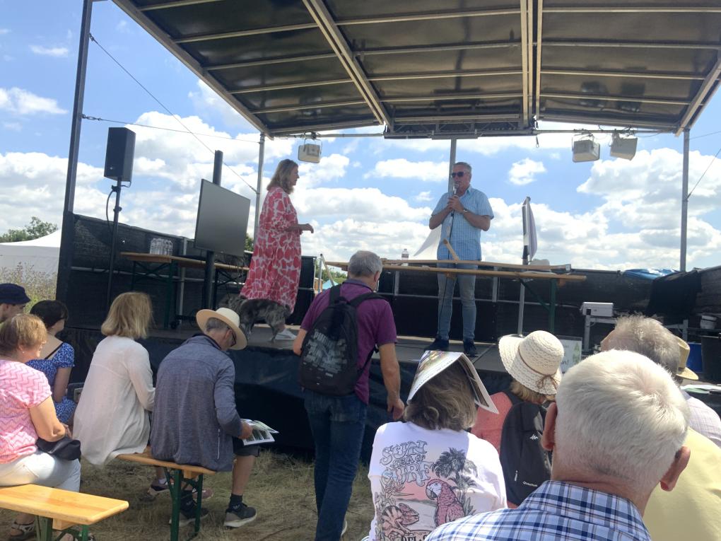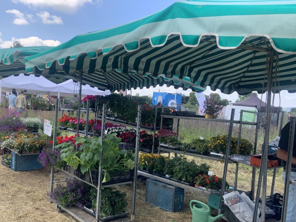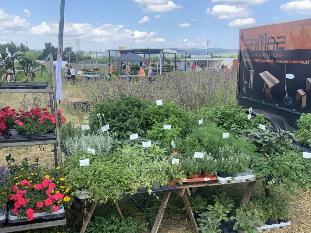 Nachdem man seinen Eintritt bezahlt und einen roten Stempel erhalten hat, steht dem Besuch nichts mehr im Wege. Es herrscht eine gelassene und zufriedene Stimmung und selbst die zahlreich mitgebrachten Hunde scheinen sich mit dem Ambiente bestens zu arrangieren. An einigen Ständen gibt es für die Vierbeiner sogar einen erfrischenden Trunk. Neben den vielen unterschiedlichen Pflanzen, die auch zahlreich gekauft werden, kann man sich fachkundig über Pflege und Gestaltung von Gärten informieren. Kunsthandwerk und Accessoires ergänzen das Angebot. Werner Ollig und Heike Boomgaarden informieren auf der Bühne über Blumenwiesen, bienenfreundliche Gärten und „schwebende Kräutergärten“. Auf den Zuschauerbänken ist kaum noch ein Platz zu ergattern als Werner Ollig seine aus Österreich mitgebrachte Sense präsentiert. „Ich habe Respekt vor der knallharten Arbeit“, stellt Ollig fest. Die Arbeit mit der Sense sei ein Ganzkörpertraining, nach 20 Minuten sei man nass geschwitzt und am nächsten Tag stelle sich der Muskelkater ein. Er erläutert dann fachkundig, wie man mit einer Sense arbeitet.
