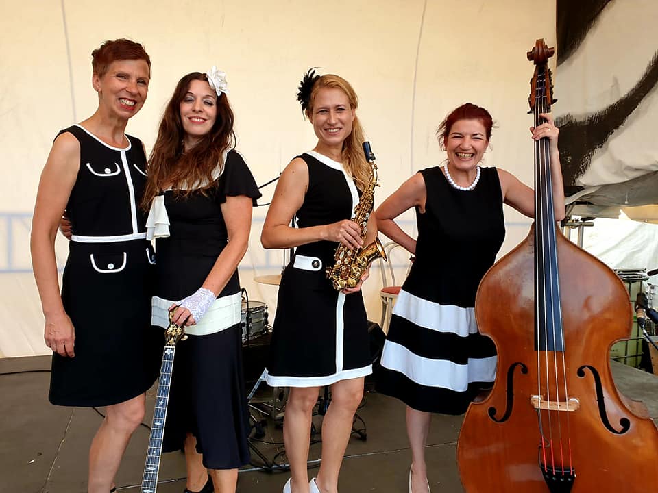 Andrea Paredes Montes alias Ruby Retroletta (Banjo & Gesang), Yvonne Roth alias Rhonda Retroletta (Saxofon & Gesang), Lexi Rumpel alias Rosie Retroletta (Kontrabass) und Uta Wagner alias Rita Retroletta (Schlagzeug & Gesang) freuen sich auf Sie!