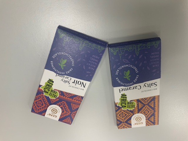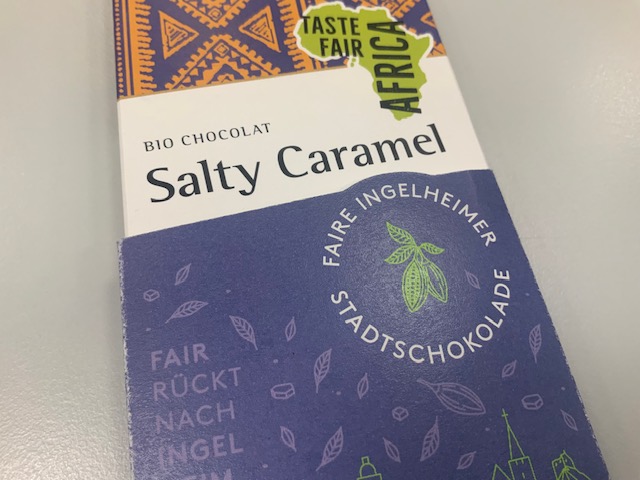 Ingelheim ist um eine Attraktion reicher, denn welche Stadt hat schon eine eigene Schokolade? Die faire Stadtschokolade ist ein Projekt der Fair- trade-town-Initiative und zeigt unter anderem die Stadtsilhouette unserer Rotweinstadt. Die Schokolade gibt es in zwei Sorten – Salty Caramel mit einem Kakaoanteil von 41% und Noir Salty Caramel mit 70% Kakaoanteil. Alle Inhaltsstoffe sind sogenannte faire Produkte, die die Lebenssituation der Kleinbauern im globalen Süden verbessern helfen. Der Schuber wurde klimaneutral und auf Recycling-Papier gedruckt.