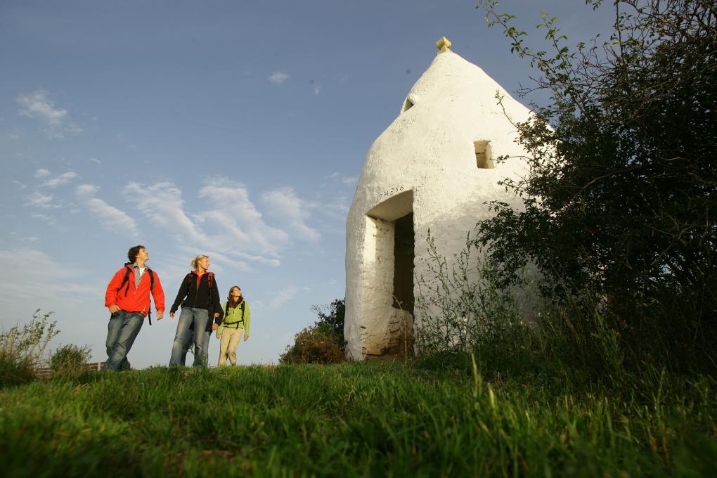 Entlang vulkanischer Andesit-Steinbrüche folgt der Weg dem Aulheimer Graben zwischen Wiesen und Weinbergen auf den Adelberg hinauf. Auf dem Berg wartet der Flonheimer Trullo, das Wahrzeichen Rheinhessens, auf die Wanderer. Der Trullo ist ein weißes Rundhaus mit Spitzdach und wurde 1756 im Stil der apulischen Trulli errichtet. Es hält sich das Gerücht, dass italienische Gastarbeiter, die in den Steinbrüchen rund um Flonheim tätig waren, den Trullo gebaut haben. Der Blick von hier oben ist fantastisch.
