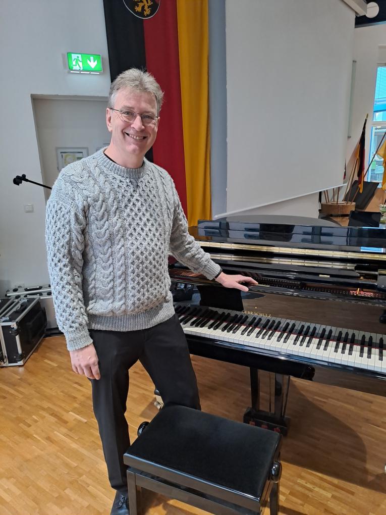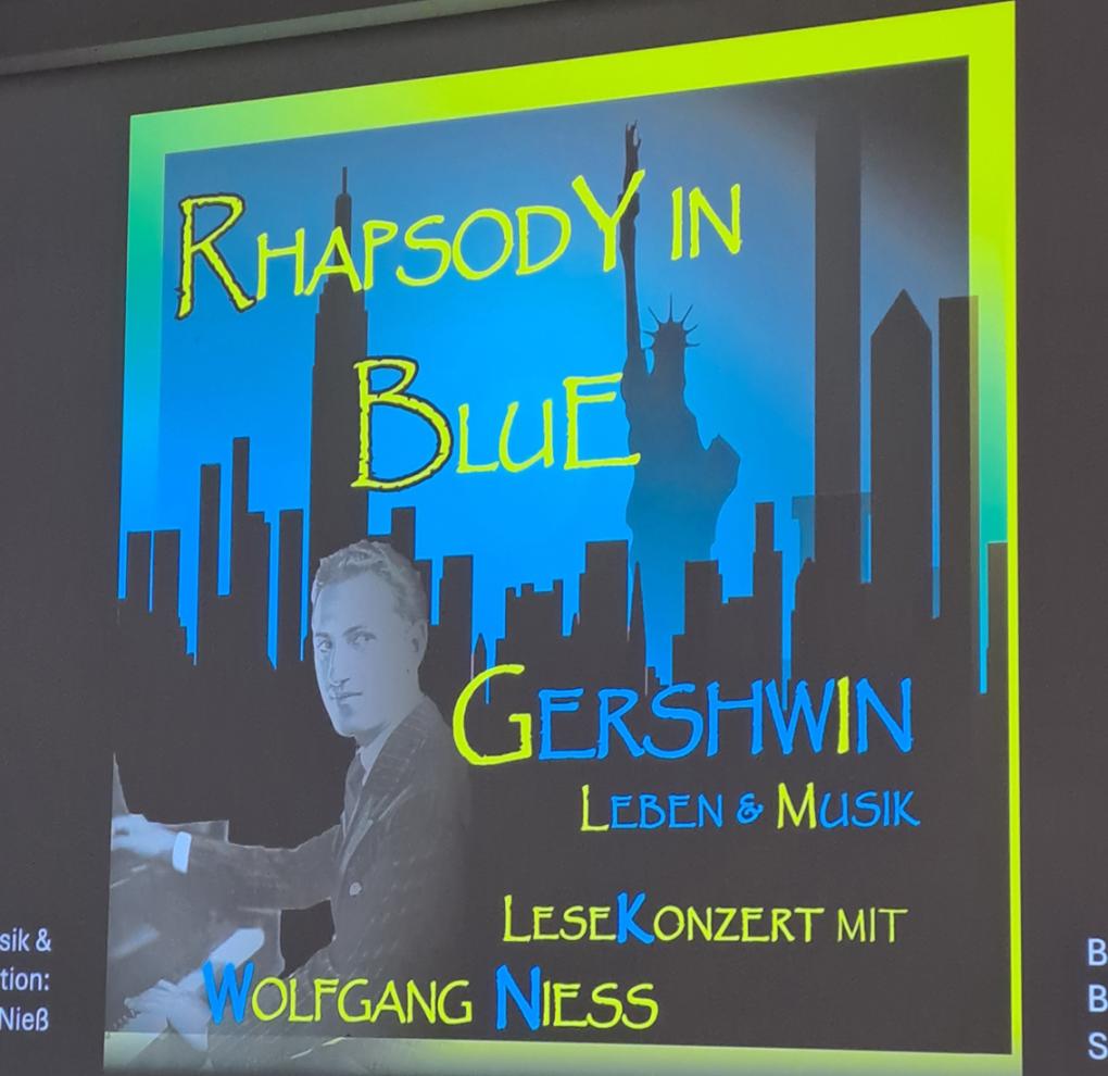 Springen wir zum 21. Februar des Jahres 2026. In Ingelheim im Sitzungssaal des Kreistags Mainz-Bingen hat sich ein ebenso gespanntes Publikum eingefunden – eingeladen von den rheinhessischen Landfrauen zum alljährlichen Frauenfrühstück. Und da gibt es zusätzlich zu dem opulenten Frühstücksangebot – quasi „on top“ – auch noch ein kulturelles „Schmankerl“. Und das trägt den Titel „Rhapsody in blue“. Es ist ein „Lese-Konzert“ mit untermalender Bildpräsentation zu dem Schaffen von George Gershwin. Am Flügel (ein solcher gehört zum Inventar des Sitzungssaals) interpretiert Wolfgang Nieß virtuos Stücke des leider schon früh (im Alter von 38 Jahren) verstorbenen Komponisten und gibt dazwischen noch erläuternde Einblicke in dessen Leben. Zusammen mit den von Sabina Nieß sorgsam ausgewählten Bildern entsteht so ein Kaleidoskop einer Zeit, in der auch musikalisch epochale Umbrüche statt- fanden. Und als Wolfgang Nieß seine Interpretation von Gershwins Meisterwerk beendet hatte, war ein anerkennende „Wow“ noch eine der moderatesten Beifallsbekundungen.