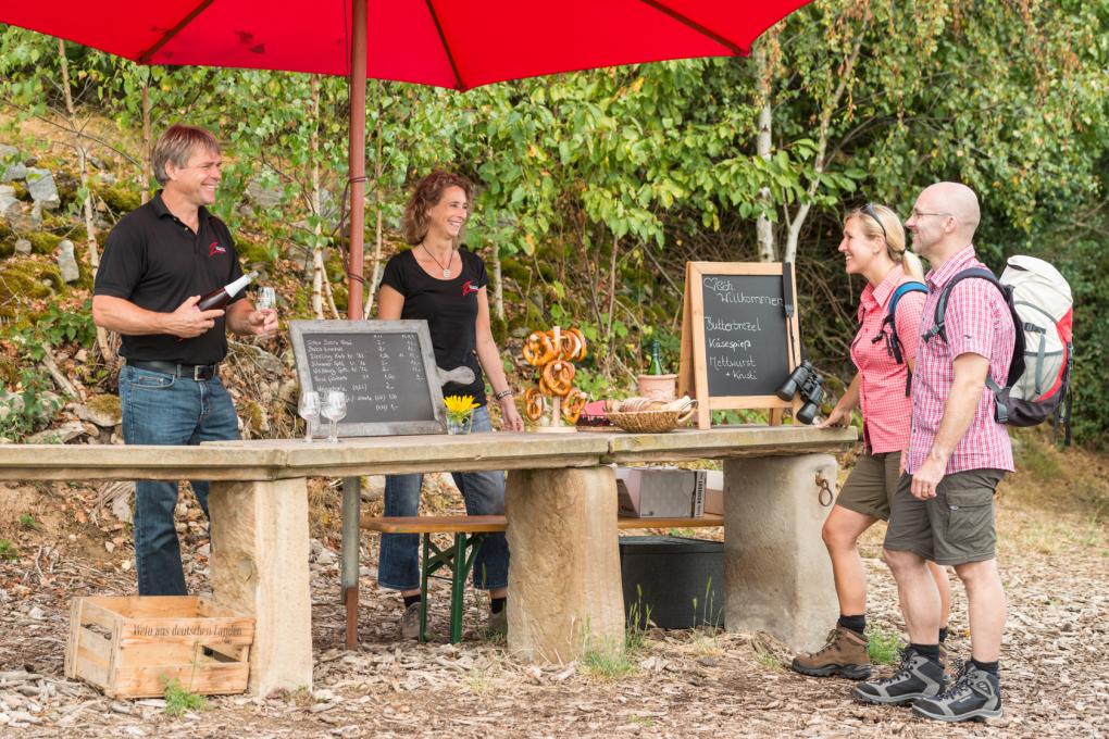Treffpunkt Wein Nicht nur für alte Knaben gehört ein erfrischendes Glas Wein zu den guten Gaben. Auch Wanderer freuen sich, wenn ganz unverhofft ein liebevoll hergerichteter Ausschank am Wegesrand zu einer weinfrohen Pause einlädt. Für die Kinder gibt’s Traubensaft, und wer Hunger hat, kann sich kleine deftige Leckereien aus der Winzerküche schmecken lassen. So gestärkt, sind die nächsten Kilometer fast ein Katzensprung. Und zum krönenden Abschluss geht’s dann mit gekonntem Einkehrschwung in eines der zahlreichen Landgasthäuser, die allein schon einen Ausflug wert sind.