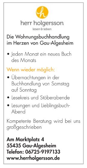 Anfragen nach dem Wunschartikel können über Telefon, WhatsApp, Instagram oder Facebook gestellt werden. „Über die sozialen Medien (Facebook: die Wohnscheune Gau-Algesheim und Instagram: diewohnscheune) erfahren die Kunden immer die aktuellen News und Produkte der Wohnscheune, also reichschauen lohnt sich“, bemerkt Jens Zeller. Auch wenn der Laden wieder geöffnet hat, findet immernoch das entspannte Privatshoppen mit Anmeldung statt. Reinschauen lohnt sich aber auch bei den anderen Geschäftsleuten in Gau-Algesheim, erwähnt Jens Zeller, der mit allen Einzelhändlern vor Ort ein gutes Verhältnis pflegt. Im Herzen von Gau-Algesheim lädt zum Beispiel Holgersson mit ihrem gemütlichen Ambiente zum Stöbern und Verweilen ein. Die mit Bedacht zusammengestellte Auswahl an Büchern, für Groß und Klein, wird ergänzt durch Spiele und Puzzle der spanischen Firma londji und Geschenkideen von good old friends. Jeden Monat erscheint ein neues „Buch des Monats“. Wenn wieder möglich, werden wieder der beliebte Lesekreis, Stöberabende, Lesungen und Lieblingsbuch-Abend durchgeführt. Übernachtungen in der Buchhandlung sind von Samstag auf Sonntag möglich. Informationen hierzu unter: https://www.herrholgersson.de. Kompetente Beratung wird immer großgeschrieben.